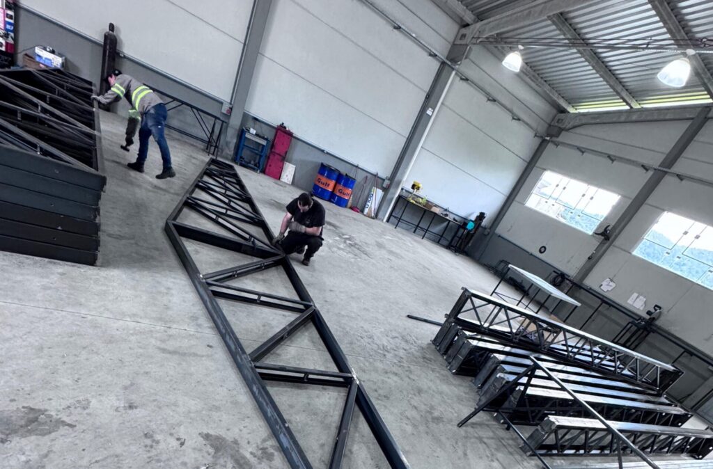A estrutura metálica é pré-fabricada com precisão industrial em ambiente controlado.